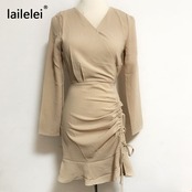 【新作】【送料無料】 2020年秋フレンチヴィンテージフリルワンピース巾着ヒップヴェスティドプリーツVネックラップ長袖バッドショートスカート ロング ラッフル ビンテージ Feminine132903134287 | Feminine