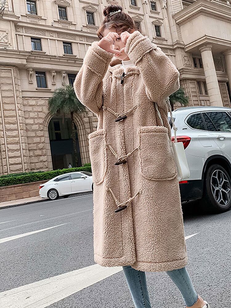 【新作】【送料無料】 子羊ウール厚手の暖かいフード付きコートホーンボタンソフトロングジャケット女性ヴィンテージ冬のフェイクファーぬいぐるみテディオーバーコート ウィンター 冬物 ビンテージ Feminine174115780786