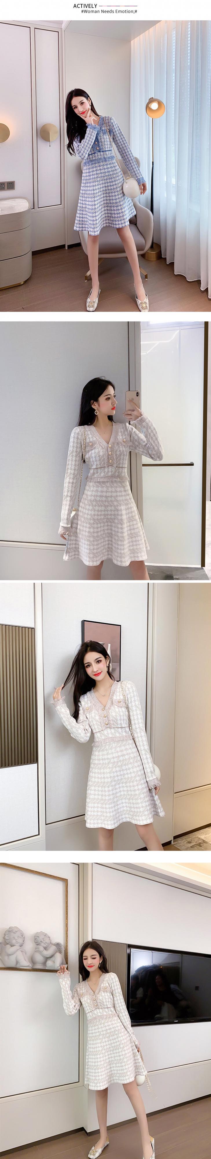 【新作】【送料無料】 千鳥格子Vネックフリンジドレスプルオーバー長袖ニット女性Vestidoヴィンテージ秋のクリックチェック柄甘い服 ロング 大人ガーリー スウィート キュート カジュアル ビンテージ Feminine141099452897 | Feminine