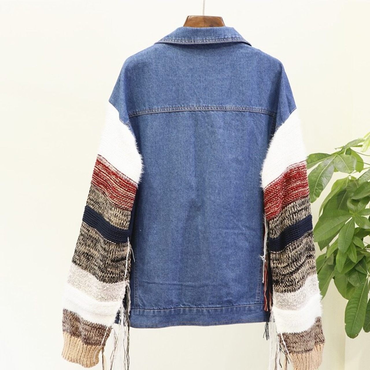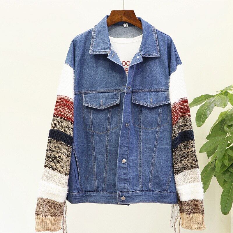 【新作】【送料無料】 Flectit特大コントラストニットスリーブデニムジャケットレディースフリンジTelジーンズジャケットストリートスタイル2019 AL Feminine256882625194 | Feminine