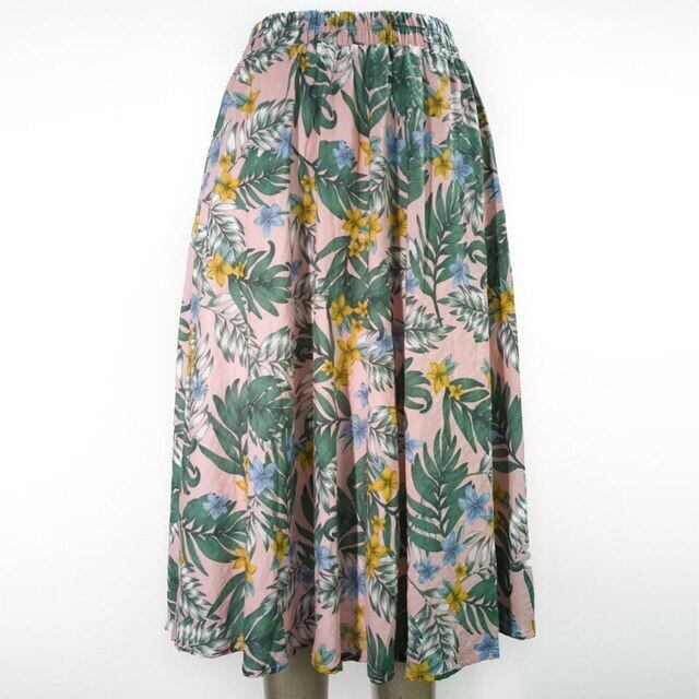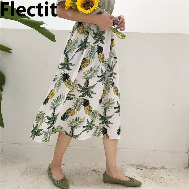 【新作】【送料無料】 フレクティックレディース自由奔放に生きるシックなトロピカルフローラルプリントスカートパイナップルムーサパームドットミドル丈伸縮性ウエストプリーツスカート エラスティック 花柄 AL Feminine221562215343 | Feminine