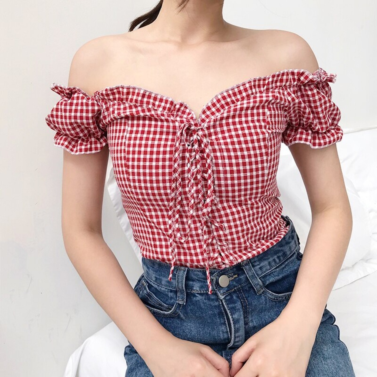 【新作】【送料無料】 Flectit Women Red Black Gingham Off Shoulder Lace Up Sexy Blouses Shirts Vintage Summer Bardot Top Blouse Feminine レッド ブラック レース シャツ ブラウス サマー 夏物 オフショルダー レースアップ ビンテージ AL Feminine25873982817 | Feminine