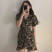 【新作】【送料無料】 Flecti Women's Ditsy Floral RuchedBodyconミニドレスサマー半袖Vネックフリルショートドレス* ハーフスリーブ 夏物 花柄 AL Feminine270596399796 | Feminine