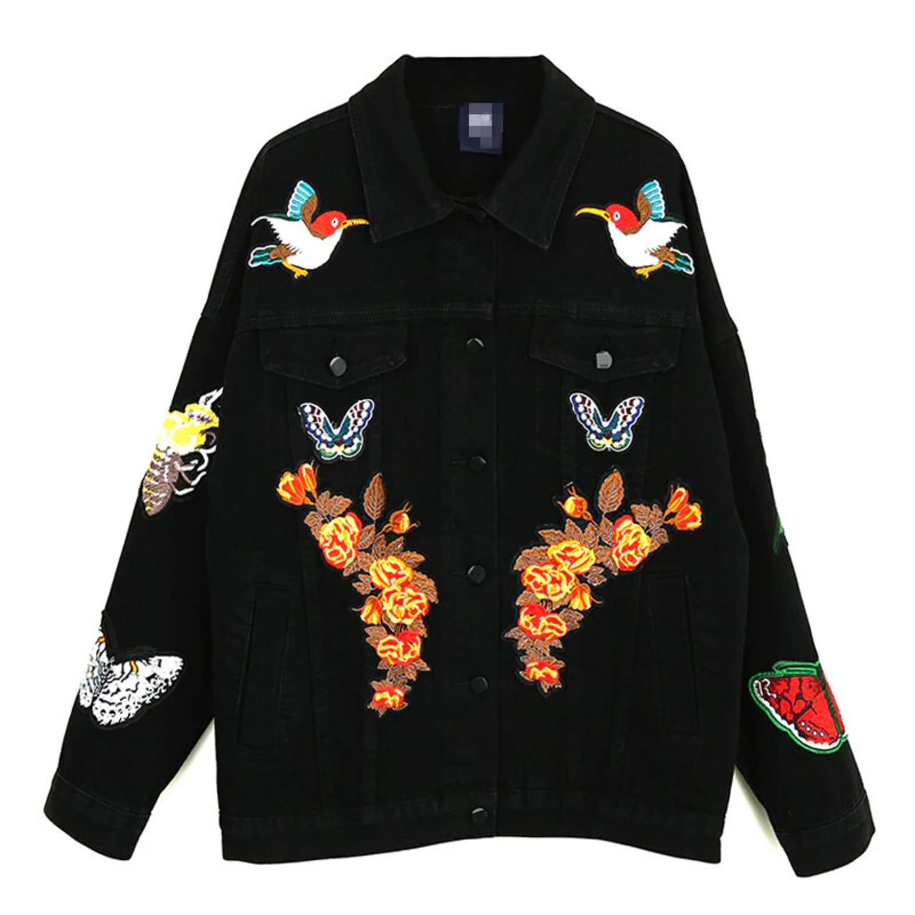 【新作】【送料無料】 フレクティットフラワーアニマルエンブロイダリーデニムジャケットレディースオーバーサイズロングスリーブラペルポケット付きヴィンテージ原宿スタイルジーンズジャケット* 長袖 刺繍 かわいい フラワーデザイン ビンテージ AL Feminine225881838240 | Feminine
