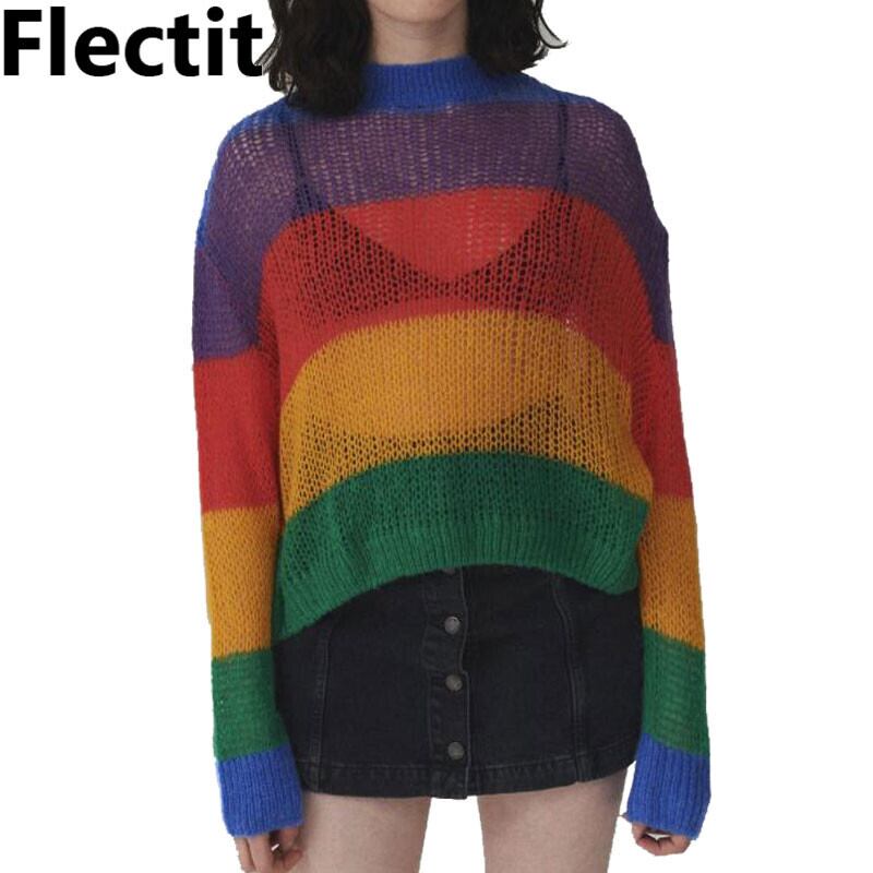 【新作】【送料無料】 Flectit LazyMohairレインボーストライプジャンパー特大クロップドクルーネック長袖コージーセーター原宿ニット* ロング かわいい AL Feminine268590758202 | Feminine