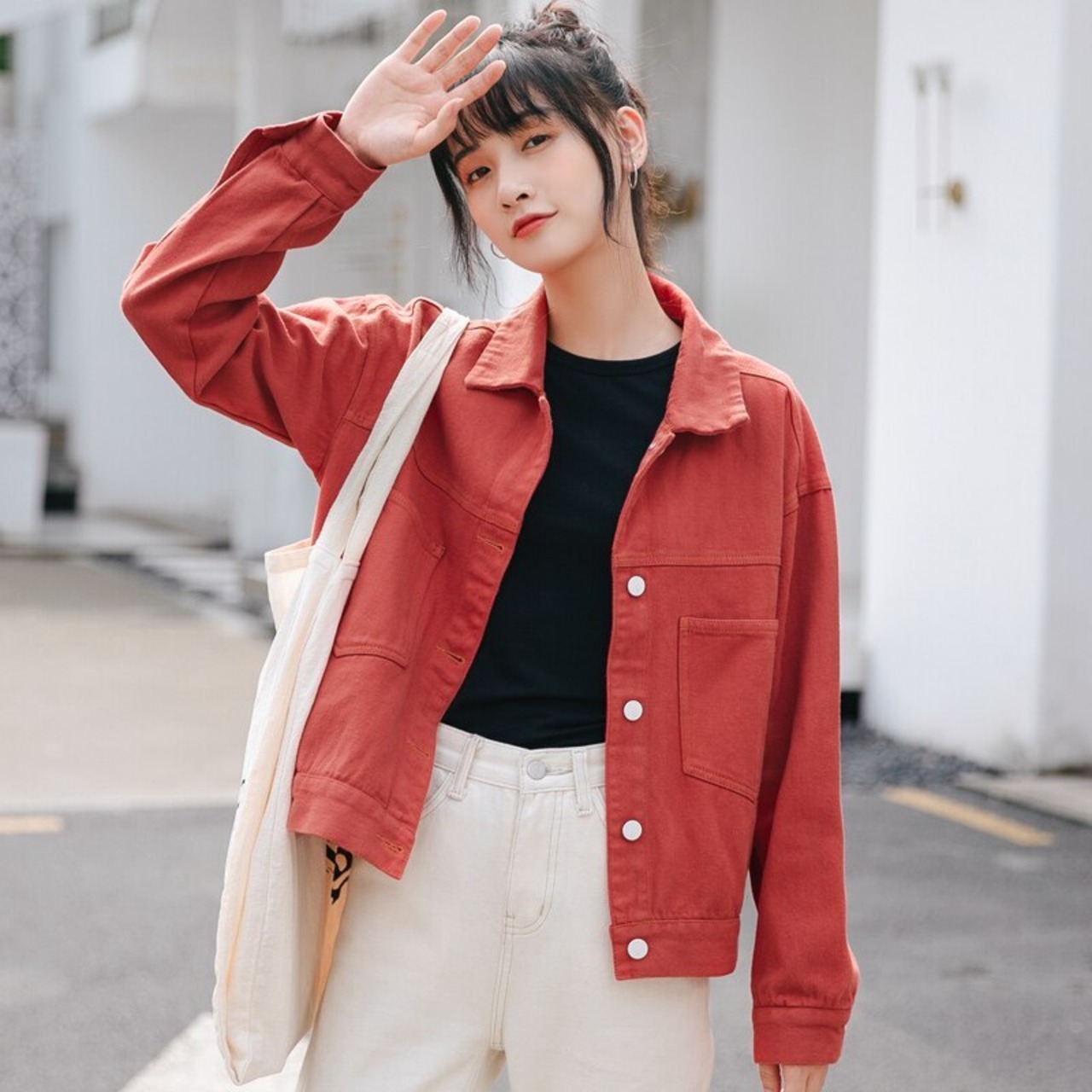 【新作】【送料無料】 フレクティットカラーデニムジャケットコントラストボタンポケットジーンズジャケットレディースアウタージャケット レッド AL Feminine252303678416 | Feminine