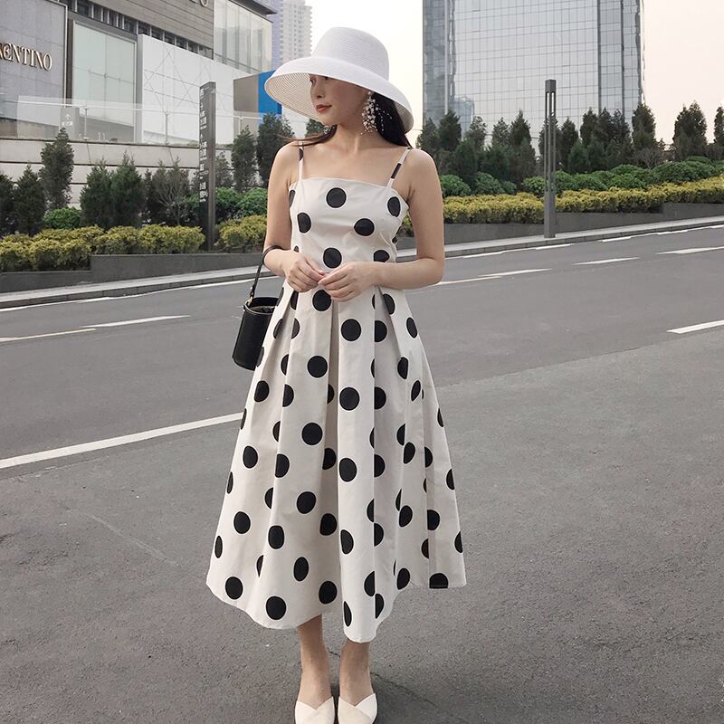 【新作】【送料無料】 Flectitステートメントポルカドットスリップドレスレディースクリックウエストボクシープリーツスパゲッティストラップミディドレスサマードレス* 夏物 AL Feminine221272206369 | Feminine