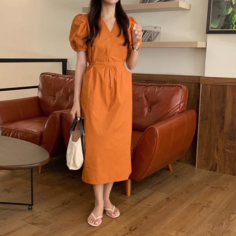 【新作】【送料無料】 オレンジネイビーブルーのポケットセルフタイシックミディドレス付きフレクティパフスリーブVネックラップドレス* AL Feminine219592895559 | Feminine