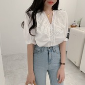 【新作】【送料無料】 フレクティットレーストリムフリルブラウスVネックパフスリーブホワイトブラウスレディーストップス春夏服* スプリング 春物 サマー 夏物 AL Feminine246242312371 | Feminine