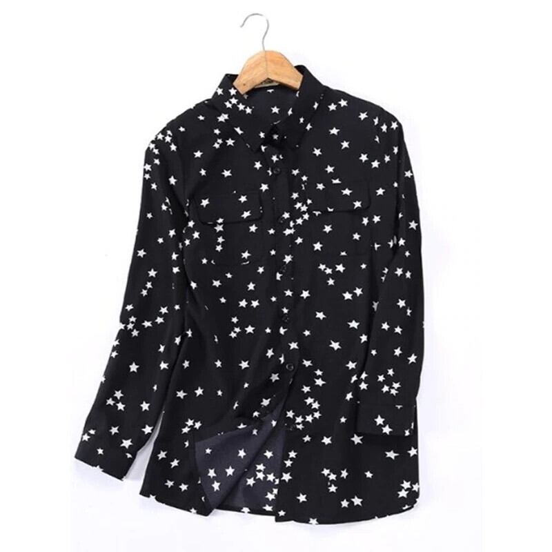 【新作】【送料無料】 Flectitなめらかなスリックスターシャツ女性長袖フロントポケットスリムフィットシグネチャースタープリントブラウストップスホワイトブラック* ロング AL Feminine240870070322 | Feminine