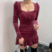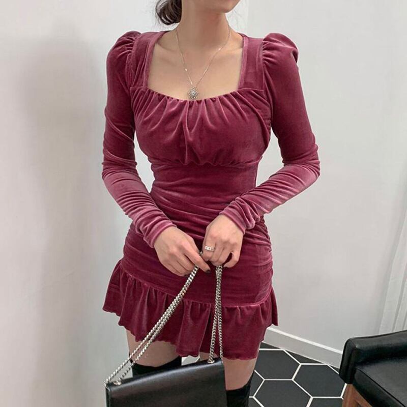 【新作】【送料無料】 セクシーなフリルベルベットドレスパフ長袖ミニボディコンブラックヴィンテージ2020春かわいいスタイルの女性の服KleiderDamen ロング 大人ガーリー スウィート キュート カジュアル スプリング 春物 ビンテージ Feminine134308012740 | Feminine