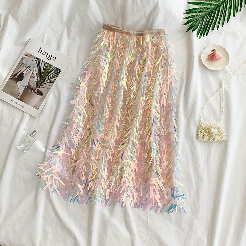 【新作】【送料無料】 フレクティットメタリックフリンジスパンコールスカートエラスティックウエストミディ丈パーティークラブディスコスカート女性装飾衣装 伸縮 AL Feminine234682318532 | Feminine