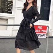 【新作】【送料無料】 FlectitティアードミディドレスメタリックスレッドVネック長袖ラップドレスセルフタイ女性セクシークラブパーティードレス衣装* ロング AL Feminine239174704064 | Feminine
