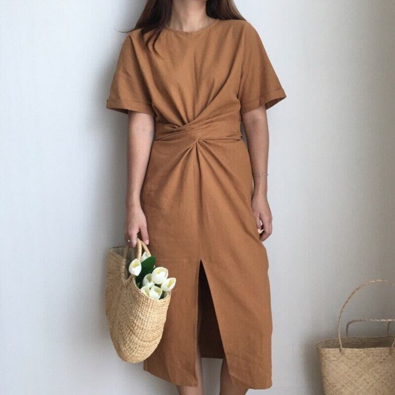【新作】【送料無料】 Flectiウィメンズネクタイノットミディドレスヴィンテージロングドレススプリットフロント半袖コットン&リネンコージードレス夏の装い* ショート ハーフスリーブ サマー 夏物 ビンテージ AL Feminine234152922094 | Feminine