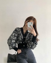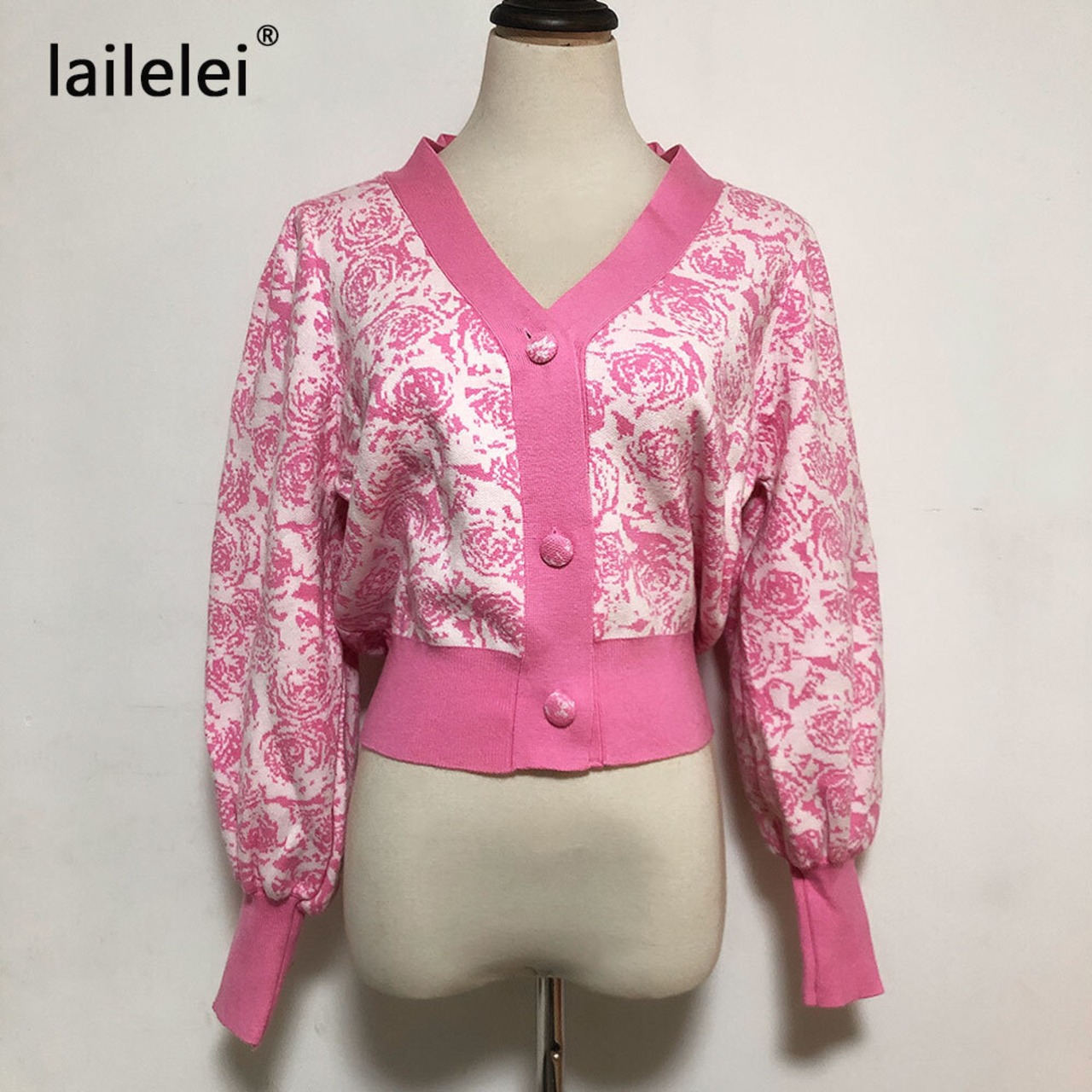 【新作】【送料無料】 VネックプリントボタンニットカーディガンパフスリーブピンクKardiganyBlusa de friofemininaシックなスタイルの女性セーター原宿 かわいい フェミニン Feminine14482153696 | Feminine