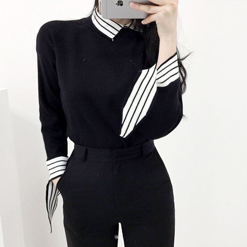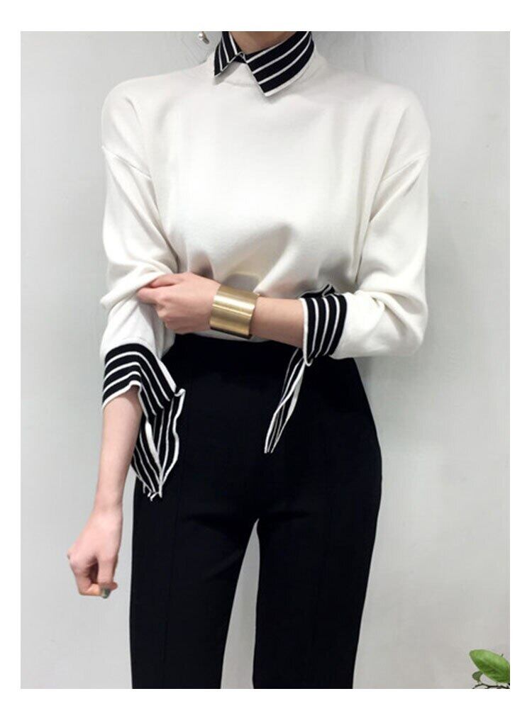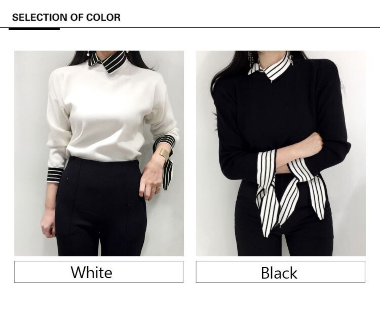 【新作】【送料無料】 ストライプレースアップバンデージステッチニットプルオーバーシャツレディースシックニットセーター2020年秋オフィスレディートップ オータム 秋物 会社 学校 通勤や通学にも Feminine154802218214 | Feminine