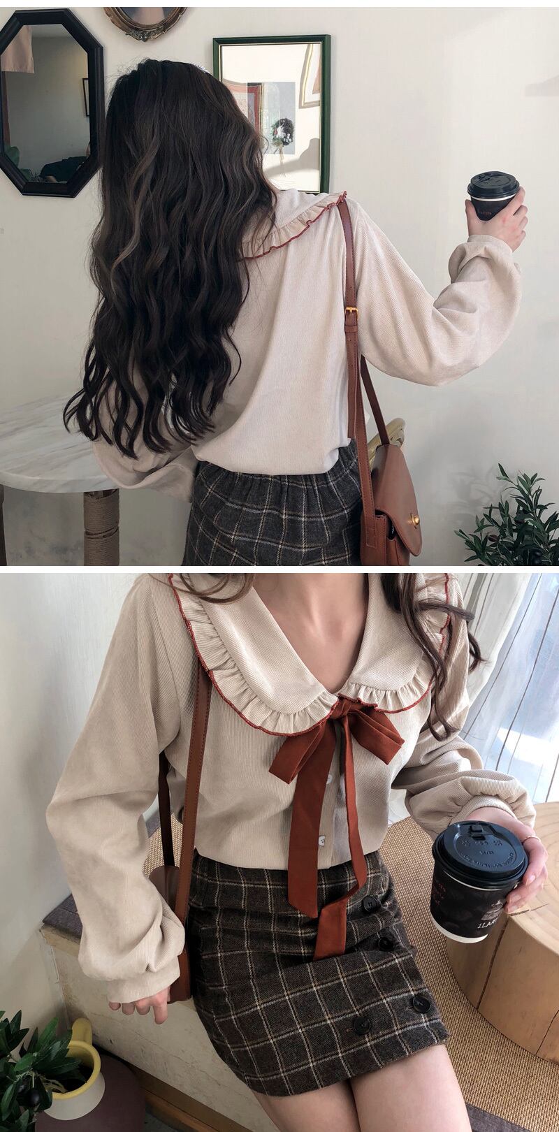 【新作】【送料無料】 ボウフランネルレディースシャツフリルカラー長袖ソフトウォームスリムシャツブラウススウィートガールコーデュロイボタン ロング ラッフル 大人ガーリー キュート カジュアル Feminine136782782359 | Feminine