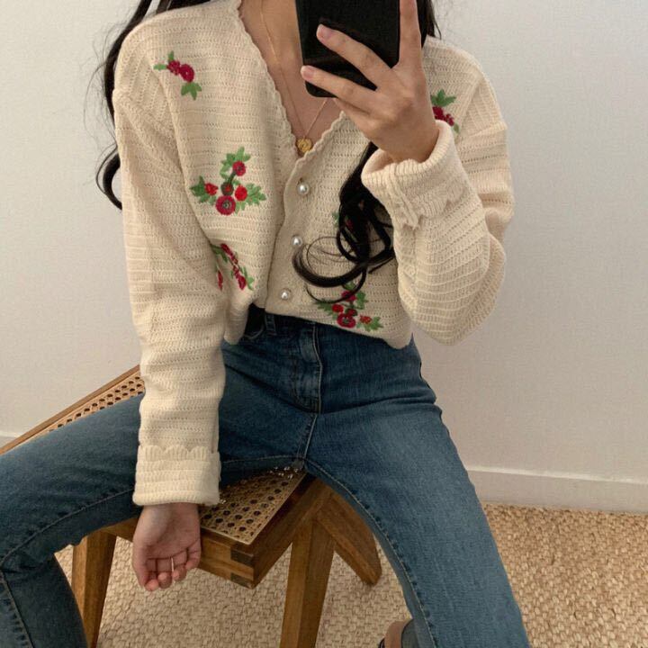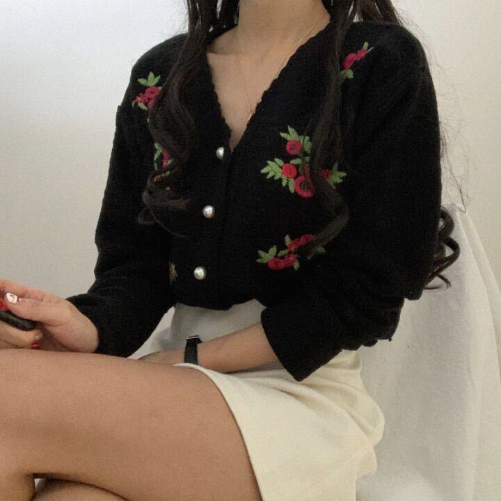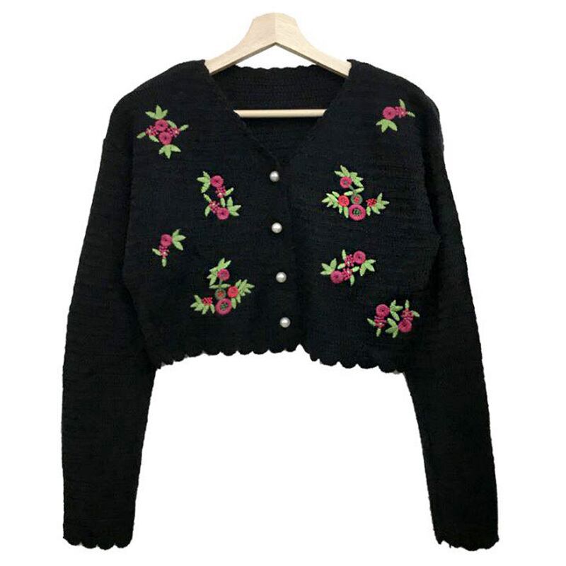 【新作】【送料無料】 刺繡クロップドカーディガンvネックニットセータースタイルレディース原宿ヴィンテージキュートブラックザ 刺繍 大人ガーリー スウィート カジュアル かわいい ビンテージ Feminine167082823313 | Feminine