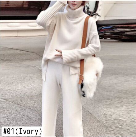 【新作】【送料無料】 SMTHMAツーピースセットレディースウィンターウォームタートルネックスプリットプルオーバーセーター+ウエストストレッチルーズワイドレッグパンツスーツ 冬物 AL Feminine217191677444 | Feminine