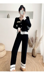 【新作】【送料無料】 SMTHMA2020秋の女性プリーツトリムVネックグレースフルセーター+パンツ2本セットOL洋服スーツ オータム 秋物 AL Feminine239795835970 | Feminine