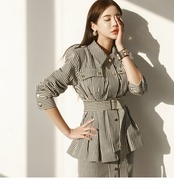 【新作】【送料無料】 オフィスセット女性ストライプツーピースシングルブレザーベルトウエストシックスカートスーツ ハーネス 会社 学校 通勤や通学にも AL Feminine277055720886 | Feminine