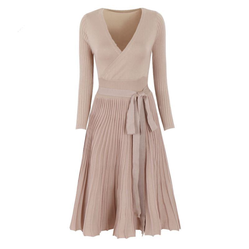 【新作】【送料無料】 SMTHMA2020レディースベーシック秋冬セータードレスソリッドセクシーVネック長袖ニットプリーツVestidos ロング オータム 秋物 ウィンター 冬物 ソリッドカラー AL Feminine216619929596 | Feminine