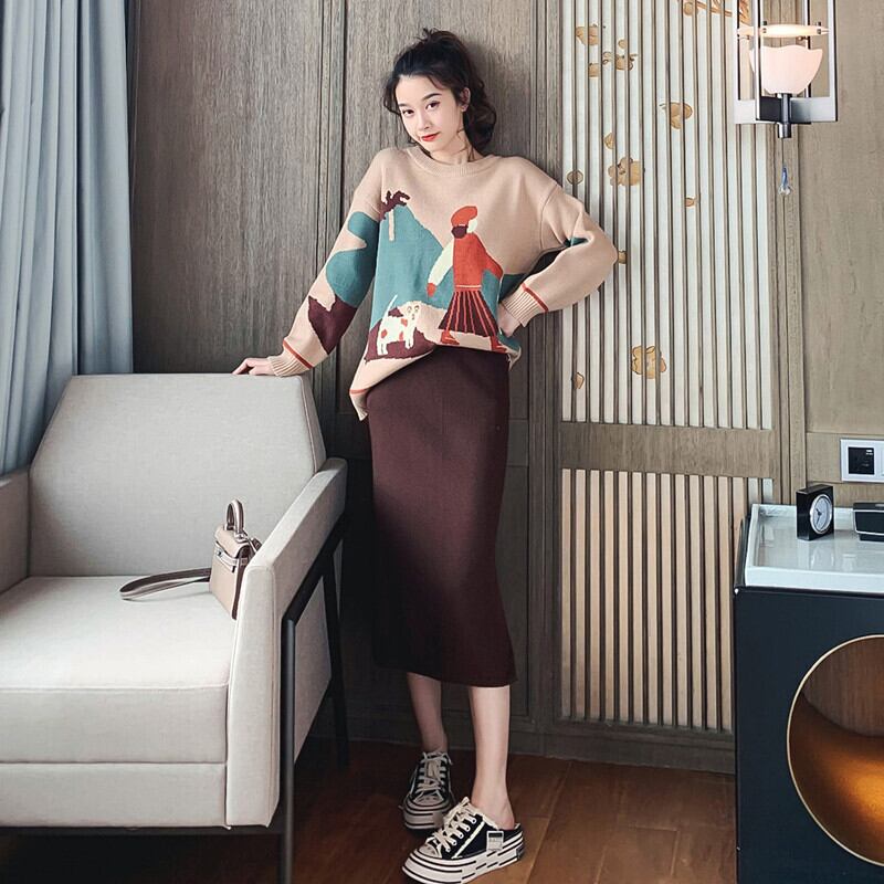 【新作】【送料無料】 SMTHMA Winter 2 Pcs Women Set O Neck Cartoon Girl Print Pullover Knit Sweater + Waist Hip Solid Skirt Suit ウィンター 冬物 スカート Oネック ソリッドカラー AL Feminine260160013 | Feminine