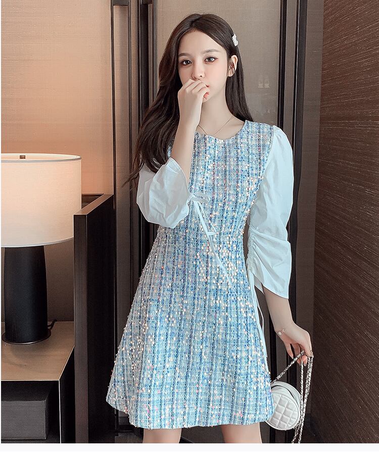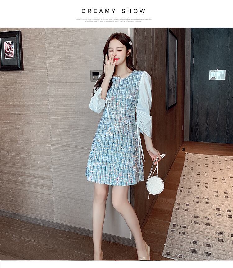 【新作】【送料無料】 SMTHMAレディースラグジュアリーヴィンテージスパンコールツイードドレス秋のドローストリングスリーブチェック柄Vestidos オータム 秋物 ビンテージ AL Feminine232281972570