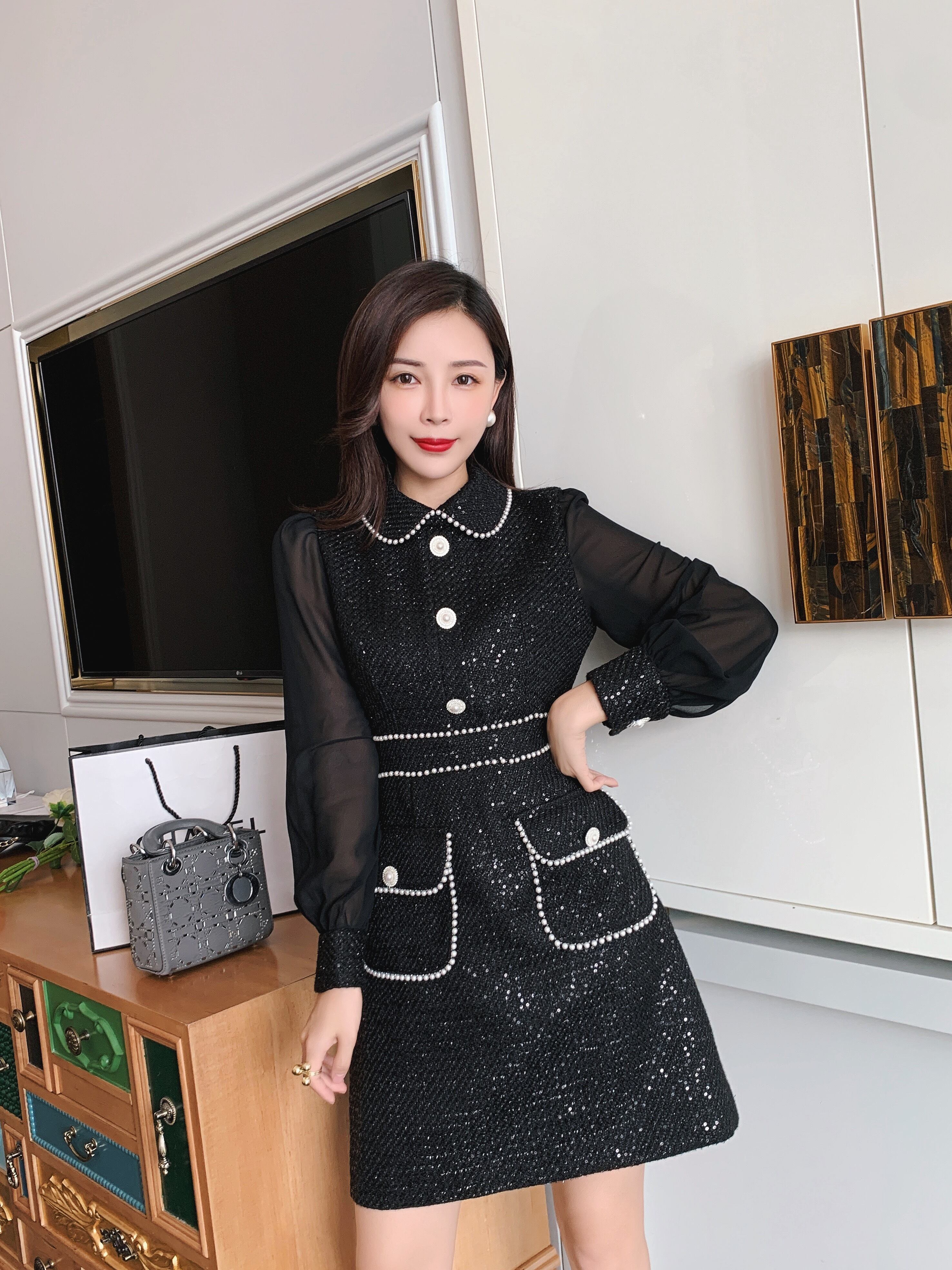 【新作】【送料無料】 SMTHMAレディース秋冬ランウェイツイードウールドレスヴィンテージパッチワーク長袖ビーディングブラックVestidos ロング オータム 秋物 ウィンター 冬物 ビンテージ AL Feminine248734170512 | Feminine