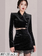 【新作】【送料無料】 SMTHMAツーピースセットドットベルベット長袖ブラックジャケット+ウエストレースパッチワークスカートスーツ ロング AL Feminine295885901518 | Feminine