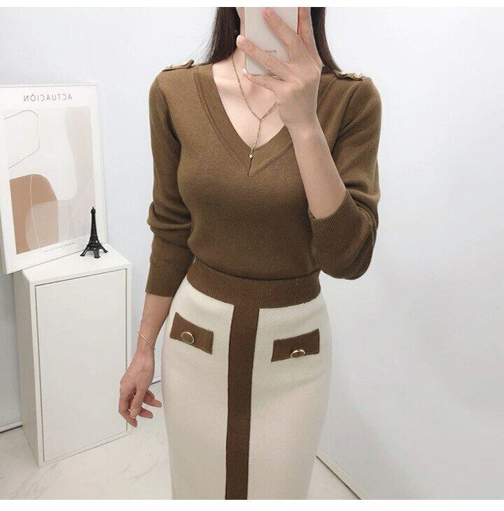 【新作】【送料無料】 SMTHMA Winter WomenVネックシックプルオーバーセーター+スカートセットPatchowrkニットスカートスーツ ウィンター 冬物 AL Feminine224479132684