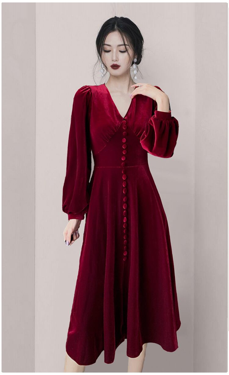 【新作】【送料無料】 SMTHMA秋冬気質VネックパーティードレススリムウエストゴールデンロングベルベットVestidoDa Festa オータム 秋物 ウィンター 冬物 AL Feminine289273727924 | Feminine