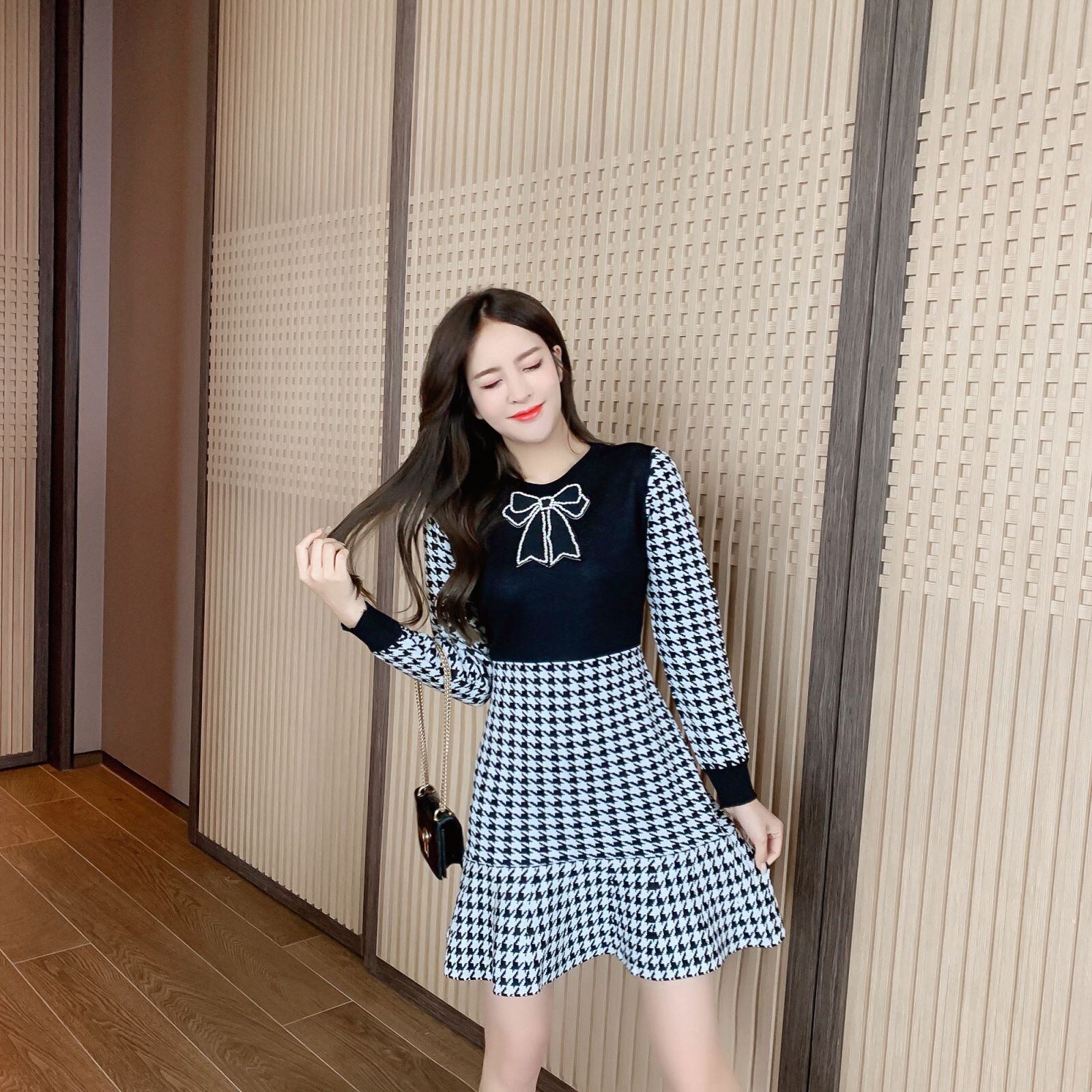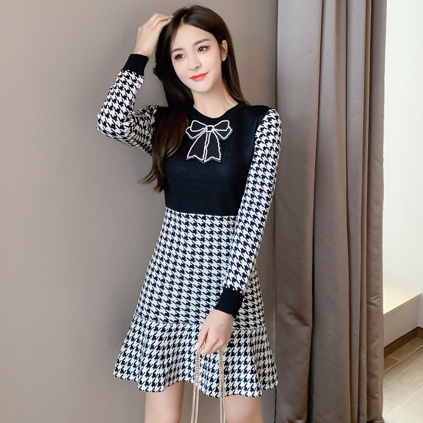 【新作】【送料無料】 SMTHMA秋冬ニット千鳥格子セータードレス女性弓長袖マーメイドVestidos ロング リボン オータム 秋物 ウィンター 冬物 AL Feminine282014115322 | Feminine