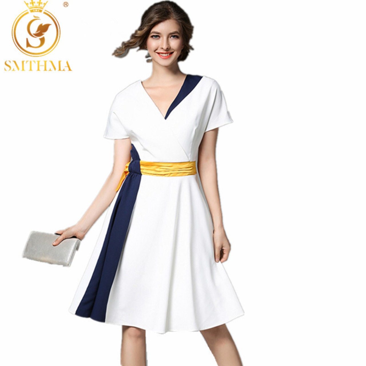 【新作】【送料無料】 SMTHMA HIGHQUALITY滑走路の女性サマーボウサッシパッチワークセクシーなVネック半袖パーティードレスVestidos ショート リボン ハーフスリーブ 夏物 AL Feminine25885740662 | Feminine