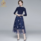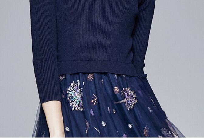 【新作】【送料無料】 SMTHMAメッシュスパンコールパッチワークニットセータードレス女性秋冬ウエスト長袖 ロング オータム 秋物 ウィンター 冬物 AL Feminine249762276530 | Feminine