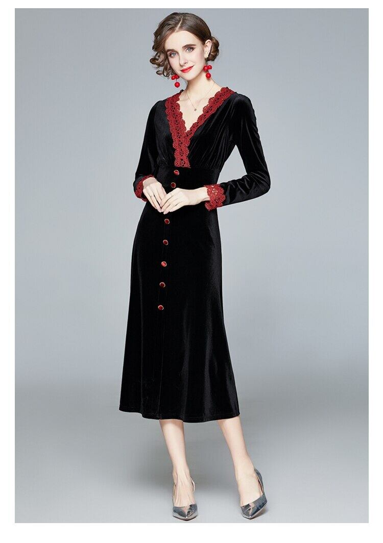 【新作】【送料無料】 SMTHMA女性レースパッチワーク長袖ベルベットパーティードレスオフィスレディセクシーなVネックミディVestidos ロング 会社 学校 通勤や通学にも AL Feminine249952393036 | Feminine