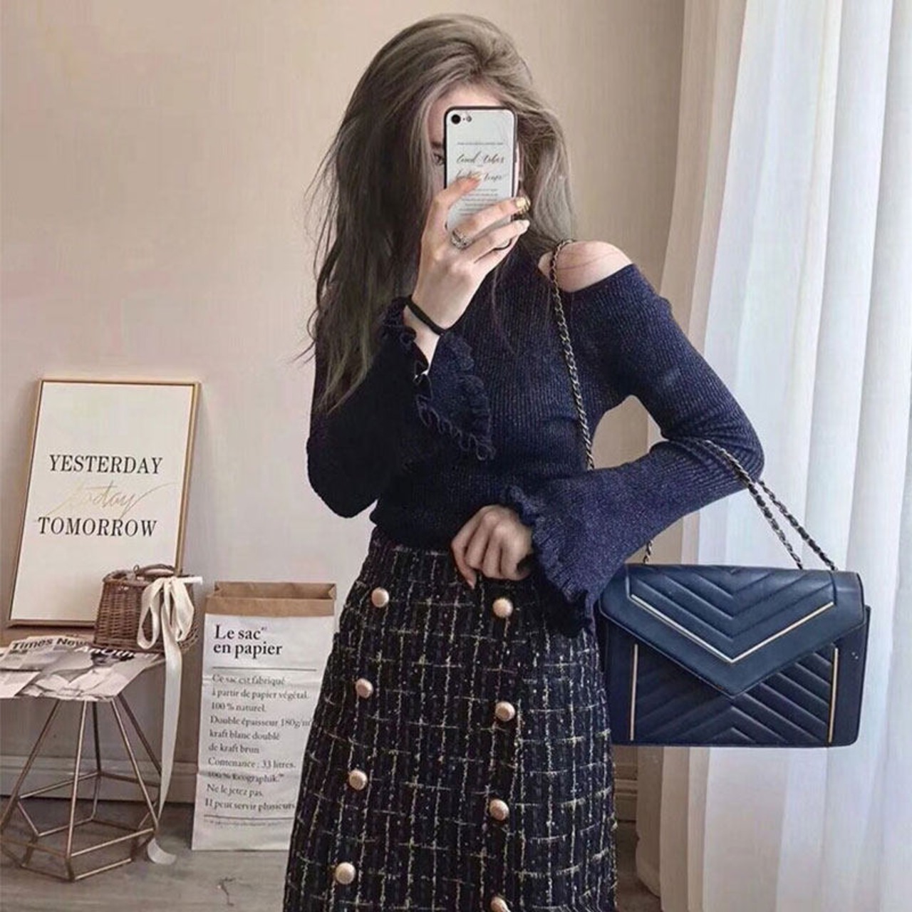 【新作】【送料無料】 ラグジュアリーフレアスリーブニットセーター2020秋冬レディースダブルブレストツイードツーピーススカートセット オータム 秋物 ウィンター 冬物 AL Feminine210878801403 | Feminine