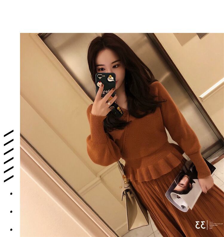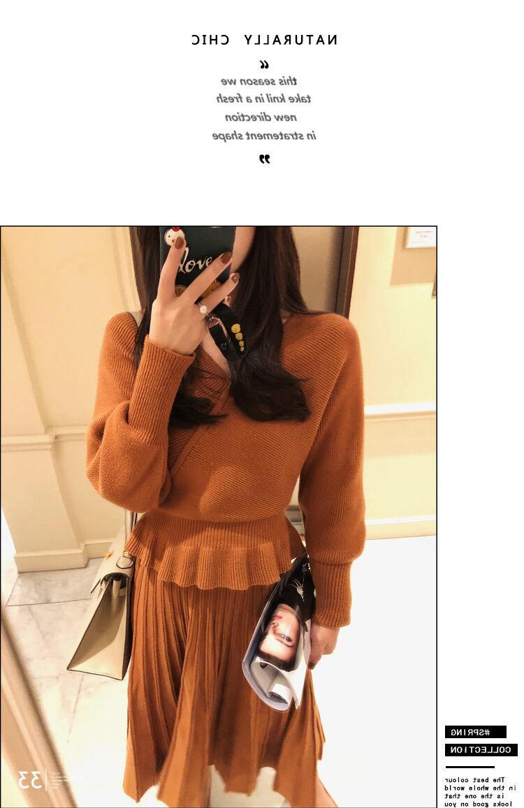 【新作】【送料無料】 SMTHMA2020新着冬ランウェイフリルセクシーVネックレディースセーターツーピースセット+伸縮性ウエストプリーツスカートレディースセット エラスティック ウィンター 冬物 AL Feminine210521263181 | Feminine
