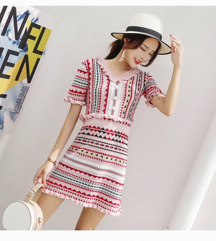 【新作】【送料無料】 SMTHMA2019夏秋幾何学的ニット半袖甘い女性Vestidosフリルトリムピンクの美しいドレス ショート ハーフスリーブ 大人ガーリー スウィート キュート カジュアル サマー 夏物 オータム 秋物 AL Feminine280497627301 | Feminine
