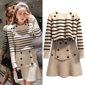 【新作】【送料無料】 2020年秋冬ニット2点セット女性長袖ストライププルオーバーセーター+ダブルブレスト滑走路ニットスカートスーツ ロング オータム 秋物 ウィンター 冬物 AL Feminine292095760976 | Feminine