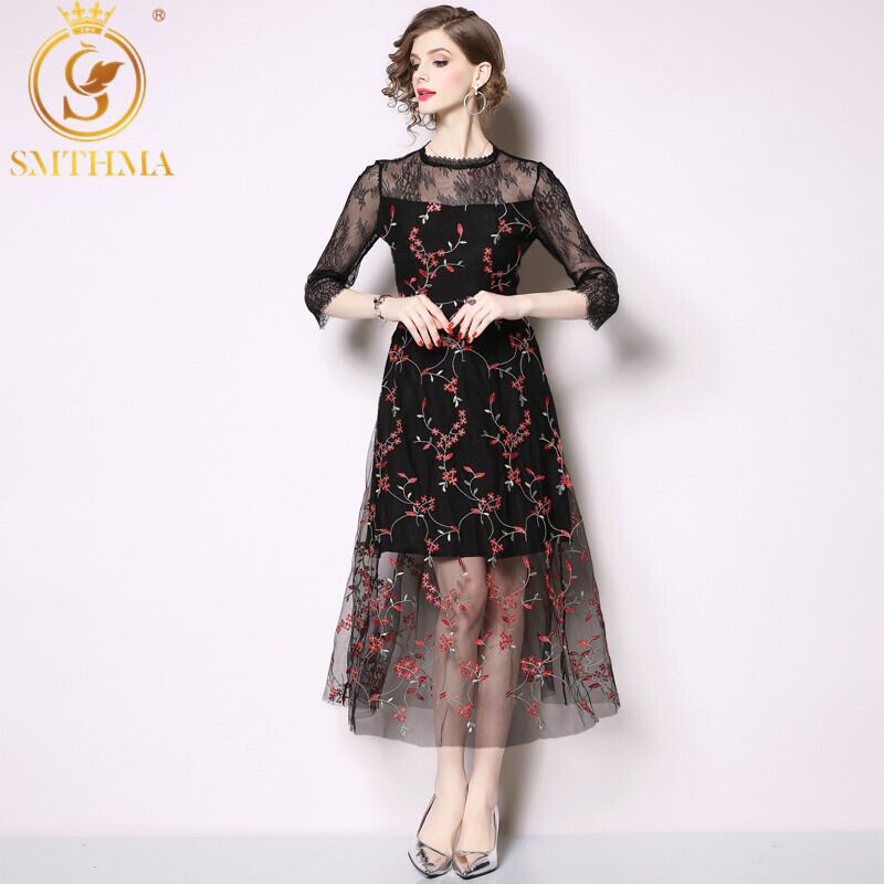 【新作】【送料無料】 SMTHMAセクシーメッシュサマーランウェイドレス女性2020刺繍フラワードレスロングドレスパーティーVestido女性服 レッド 夏物 フラワーデザイン AL Feminine216719890507 | Feminine