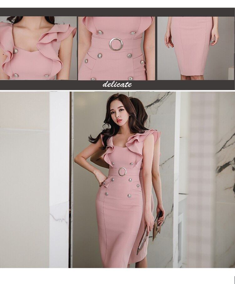 【新作】【送料無料】 SMTHMA2020到着サマーピンクドレスレディースフリルボタンスリムストラップスプリットドレスvestidos 夏物 AL Feminine244533219182 | Feminine
