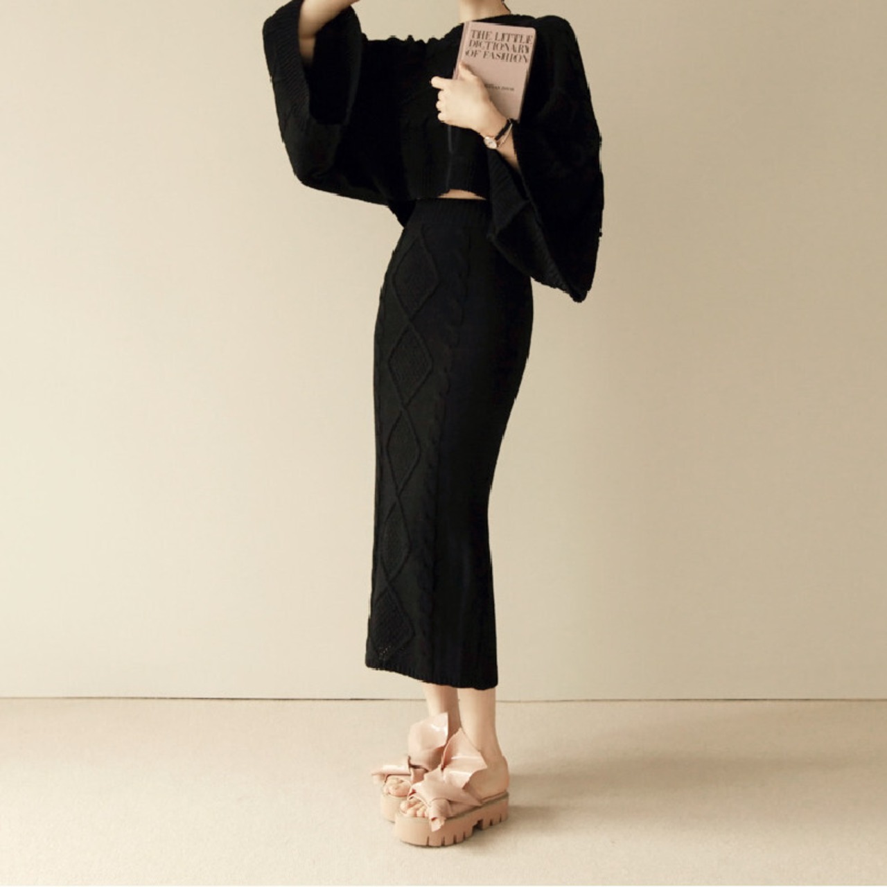 【新作】【送料無料】 SMTHMAラグジュアリーランウェイレディースウィンターウォームフレアスリーブルーズニットセーター+スリムスプリットツーピースロングスカートスーツ 冬物 AL Feminine27057814397 | Feminine