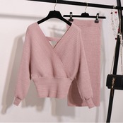 【新作】【送料無料】 SMTHMA2020ウィンターツーピースセットレディースバットウィングスリーブVネックブライトセーター+エラスティックウエストニットスカートスーツ 伸縮 冬物 AL Feminine264560463589 | Feminine