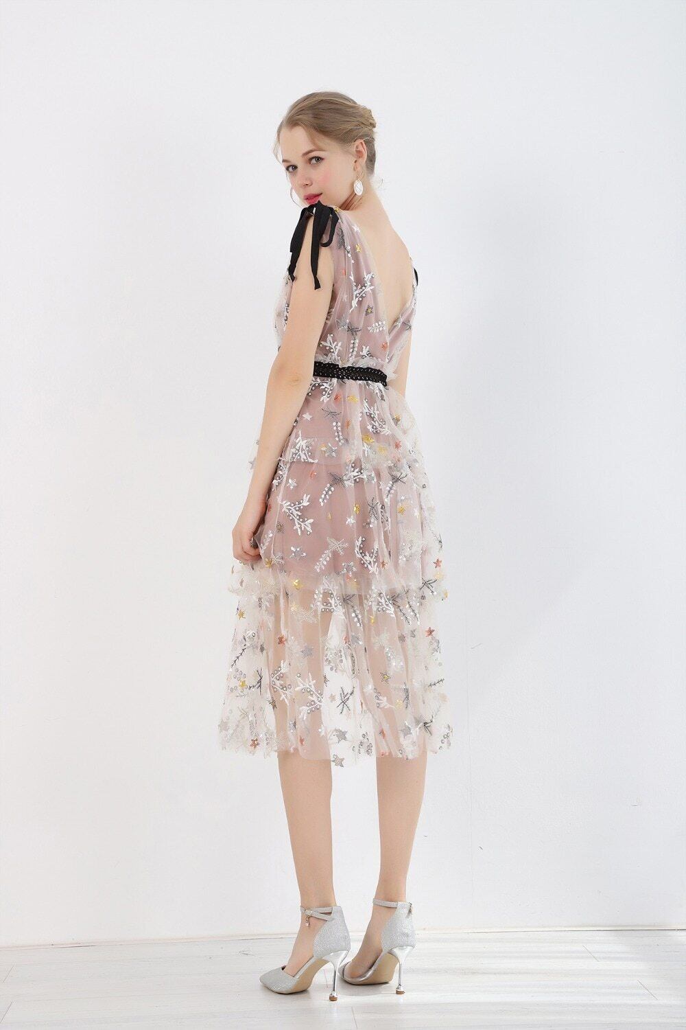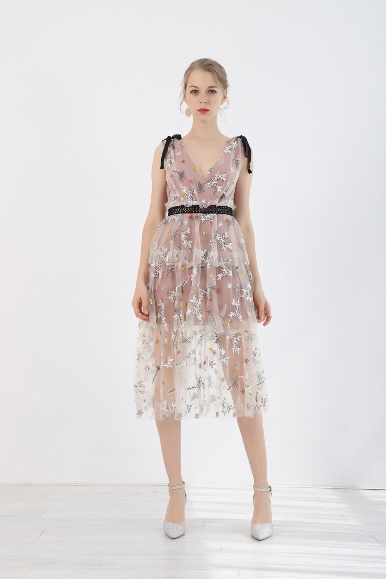 【新作】【送料無料】 セルフポートレートドレス到着メッシュスパンコール刺繡フラワーレディースサマードレスノースリーブレースロングドレス 刺繍 夏物 フラワーデザイン AL Feminine28385020846 | Feminine