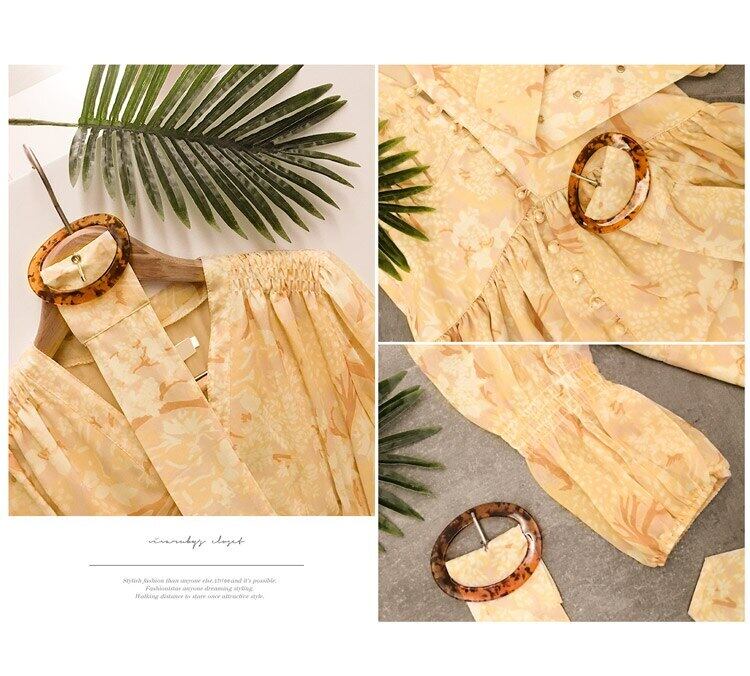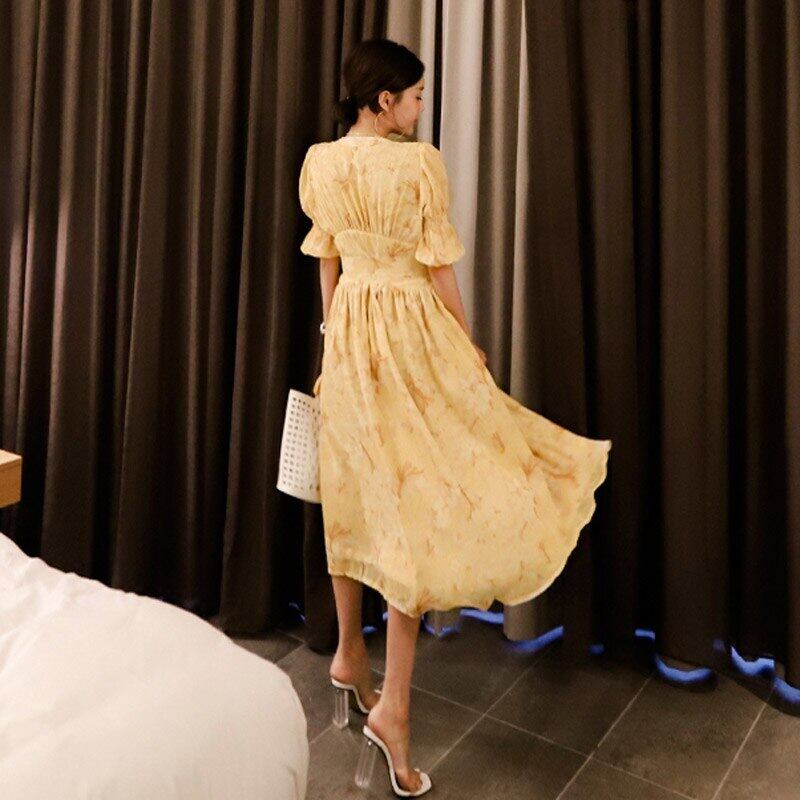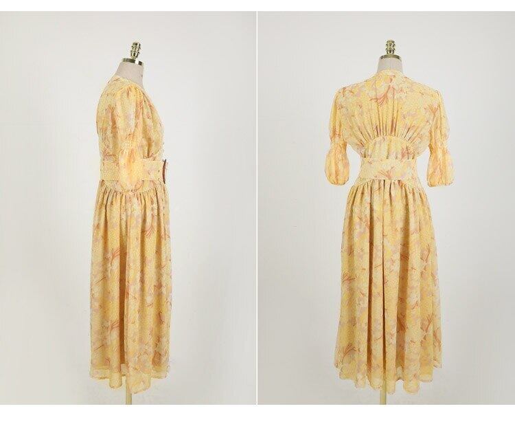 【新作】【送料無料】 2020年夏の女性シングルブレストヴィンテージドレスセクシーなVネックパフスリーブイエロープリントビッグスイングランウェイドレス サマー 夏物 ビンテージ AL Feminine285803567052 | Feminine
