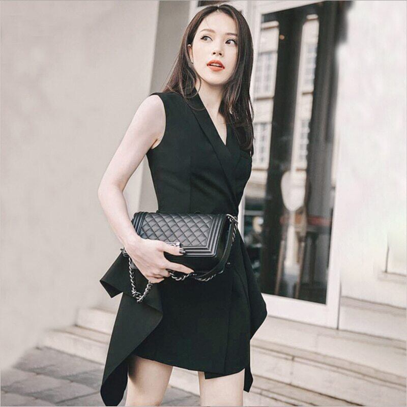 【新作】【送料無料】 SMTHMA2020女性ダブルブレストフリル不規則なドレスオフィスレディノッチカラーノースリーブドレスVestidos ラッフル 会社 学校 通勤や通学にも AL Feminine261546003863 | Feminine