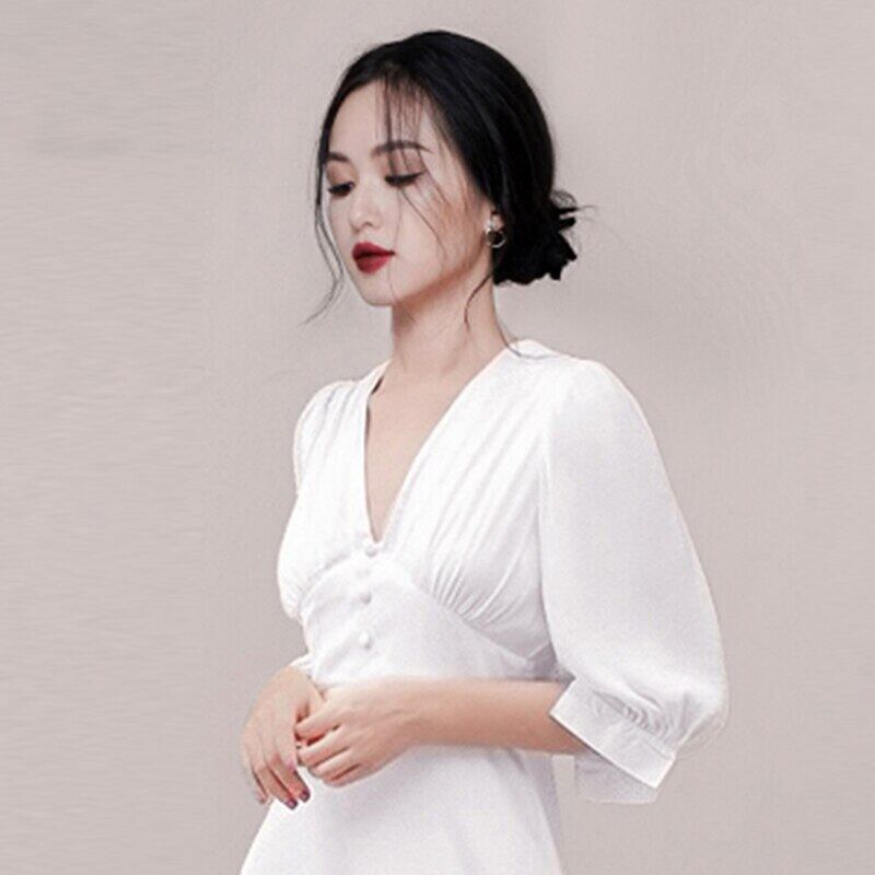 【新作】【送料無料】 SMTHMA2019サマードレスディープVネックホワイトドレスレディース無地パフスリーブプリーツドレスVestido 夏物 ソリッドカラー AL Feminine228935959518 | Feminine