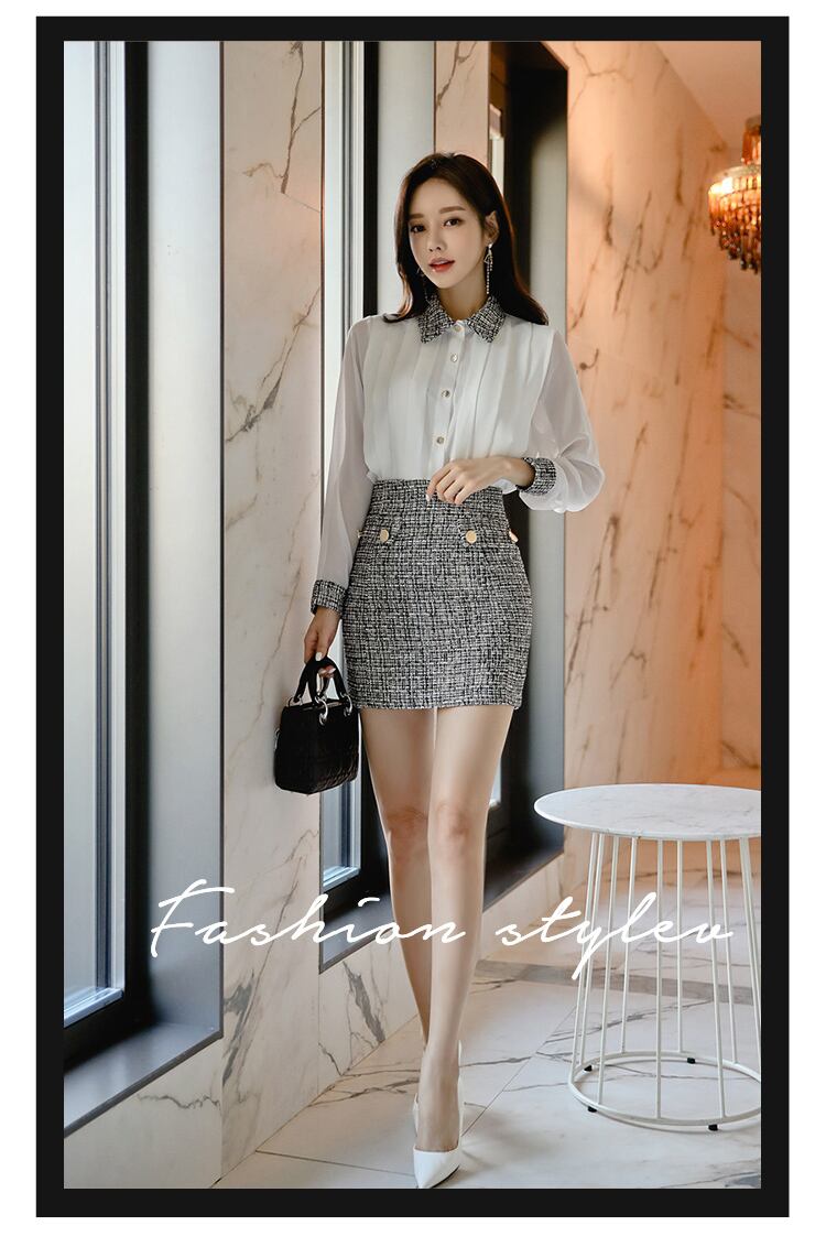 【新作】【送料無料】 SMTHMA '秋のシフォンパッチワークホワイトオフィスブラウスツーピースセットレディースミニボディコンツイードスカートワークスーツ オータム 秋物 会社 学校 通勤や通学にも AL Feminine233444969920