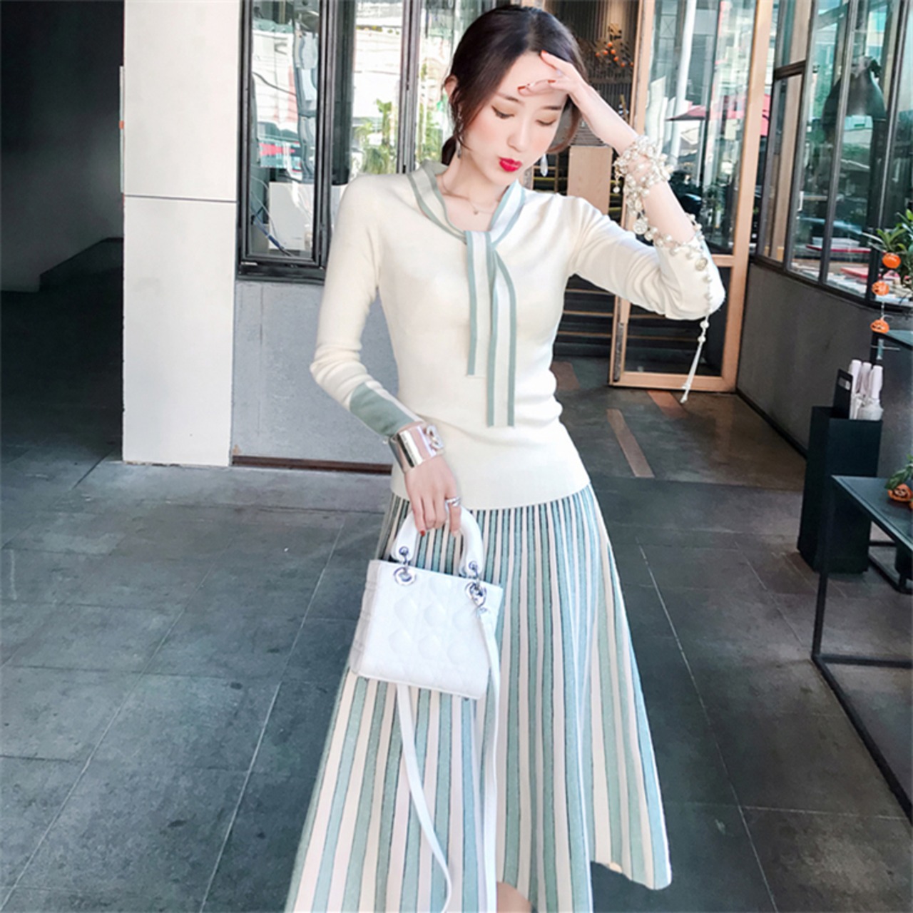 【新作】【送料無料】 SMTHMA2020秋春女性セータープルオーバー+プリーツスカート2点セットシャイニーニットミディドレススリムスーツ スプリング 春物 オータム 秋物 AL Feminine277272230251 | Feminine